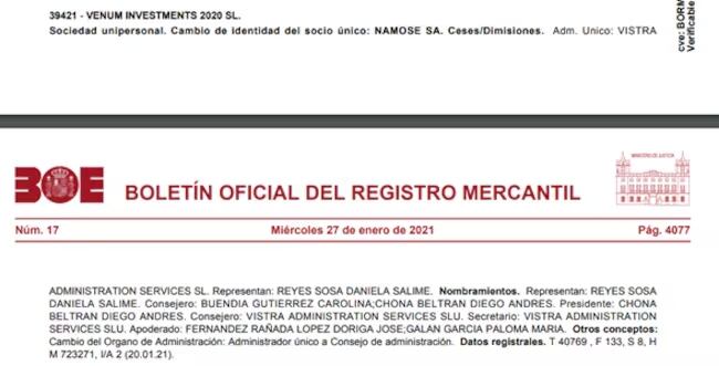 Sin embargo, Vistra solo hizo la tarea de crear a Venum y registrarla en España, porque la empresa cambió de manos en enero de 2021 según aparece en el mismo boletín del registro mercantil español de enero 27 de 2021.