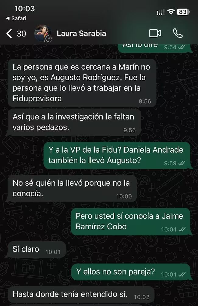 Así mismo se le preguntó sobre una posible cercanía con John Mauricio Marín. La ministra Sarabia dijo que desde que él salió del Gobierno no han vuelto a conversar y que a Daniela Andrade no la conocía cuando fue nombrada en la vicepresidencia de la Fiduprevisora.