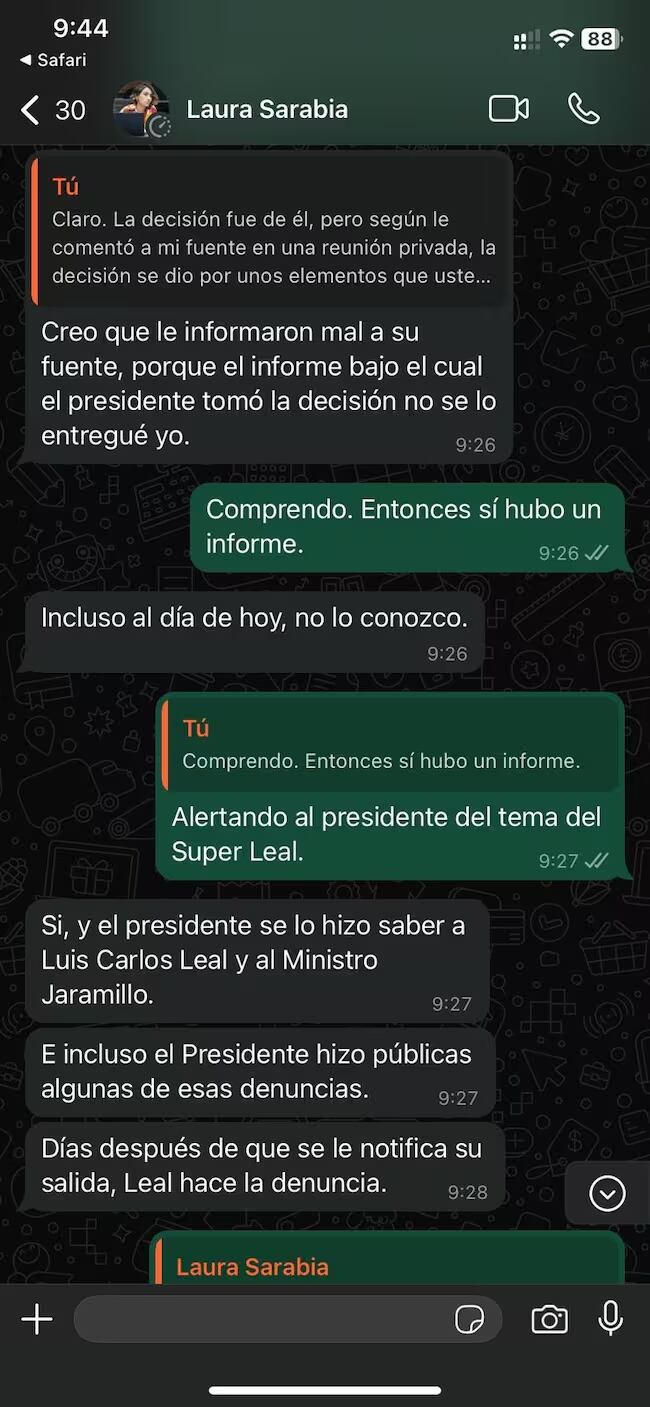 Sarabia agregó que Leal llevó a la Fiscalía General de la Nación las pistas que conducían hacia el entramado después de que se le notificó que debía abandonar el cargo. Sin embargo, La W pudo contrastar que, mientras que al superintendente le pidió la renuncia la misma Laura Sarabia el 24 de octubre, la denuncia presentada por él ante el órgano investigador sobre los manejos irregulares en las IPS fue radicada tres días antes y el mismo 24 estaba rindiendo versión libre por citación de la Fiscalía