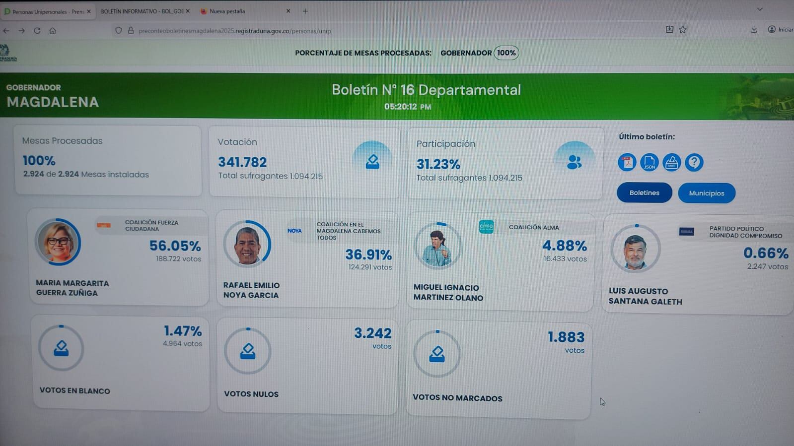 Con un total de 188 mil 722 votos que corresponden al 100% de mesas escrutadas, María Margarita Guerra Zúñiga es la nueva gobernadora del Magdalena. La abogada con maestría en Derecho Público. Ha estado vinculada con temas de juventud, educación y derechos sociales,