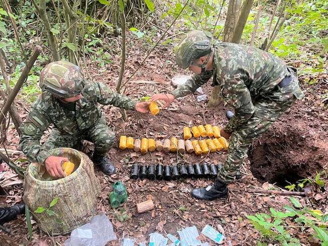 En el lugar se hallaron 26 minas antipersonal, 45 artefactos explosivos improvisados con sistema de activación por mecha de seguridad, 103 metros de cordón detonante de diferentes gramos, 67 metros de mecha de seguridad, 20 detonadores eléctricos y 40 jeringas.
