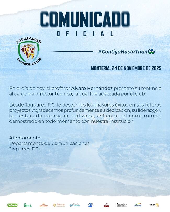 El profesor Álvaro Hernández presentó su renuncia al cargo de director técnico, la cual fue aceptada por el club. Desde Jaguares F.C. le deseamos los mayores éxitos en sus futuros proyectos. Agradecemos profundamente su dedicación, su liderazgo y la destacada campaña realizada, así como el compromiso demostrado en todo momento con nuestra institución”, informaron las directivas en la red social X.