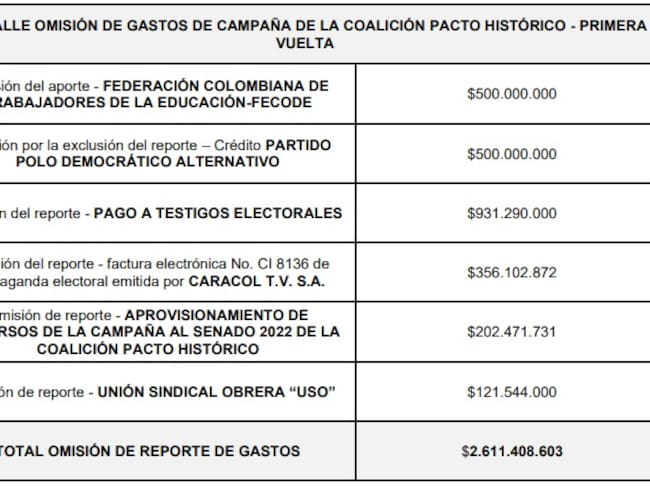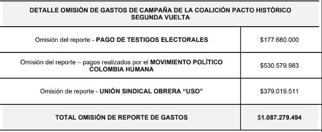 Las omisiones de los gastos en la primera vuelta tendrían que ver con la supuesta donación de Fecode por $500 millones, que habrían entrado a la campaña a través del partido Colombia Humana, y que tenía como representante legal en su momento al exsuperintendente de Servicios Públicos, Dagoberto Quiroga. También se reporta un crédito que habría hecho el Polo a la campaña por $500 millones.