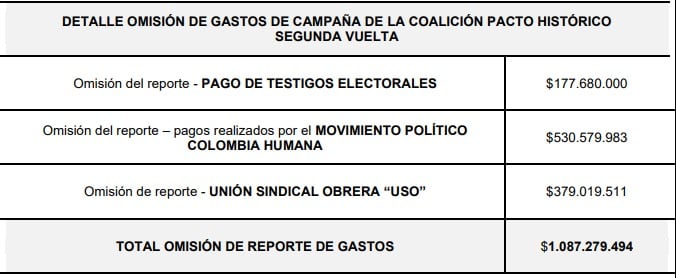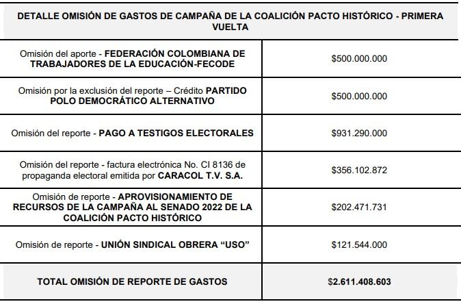 Las omisiones de los gastos en la primera vuelta tendrían que ver con la supuesta donación de Fecode por $500 millones, que habrían entrado a la campaña a través del partido Colombia Humana, y que tenía como representante legal en su momento al exsuperintendente de Servicios Públicos, Dagoberto Quiroga. También se reporta un crédito que habría hecho el Polo a la campaña por $500 millones.