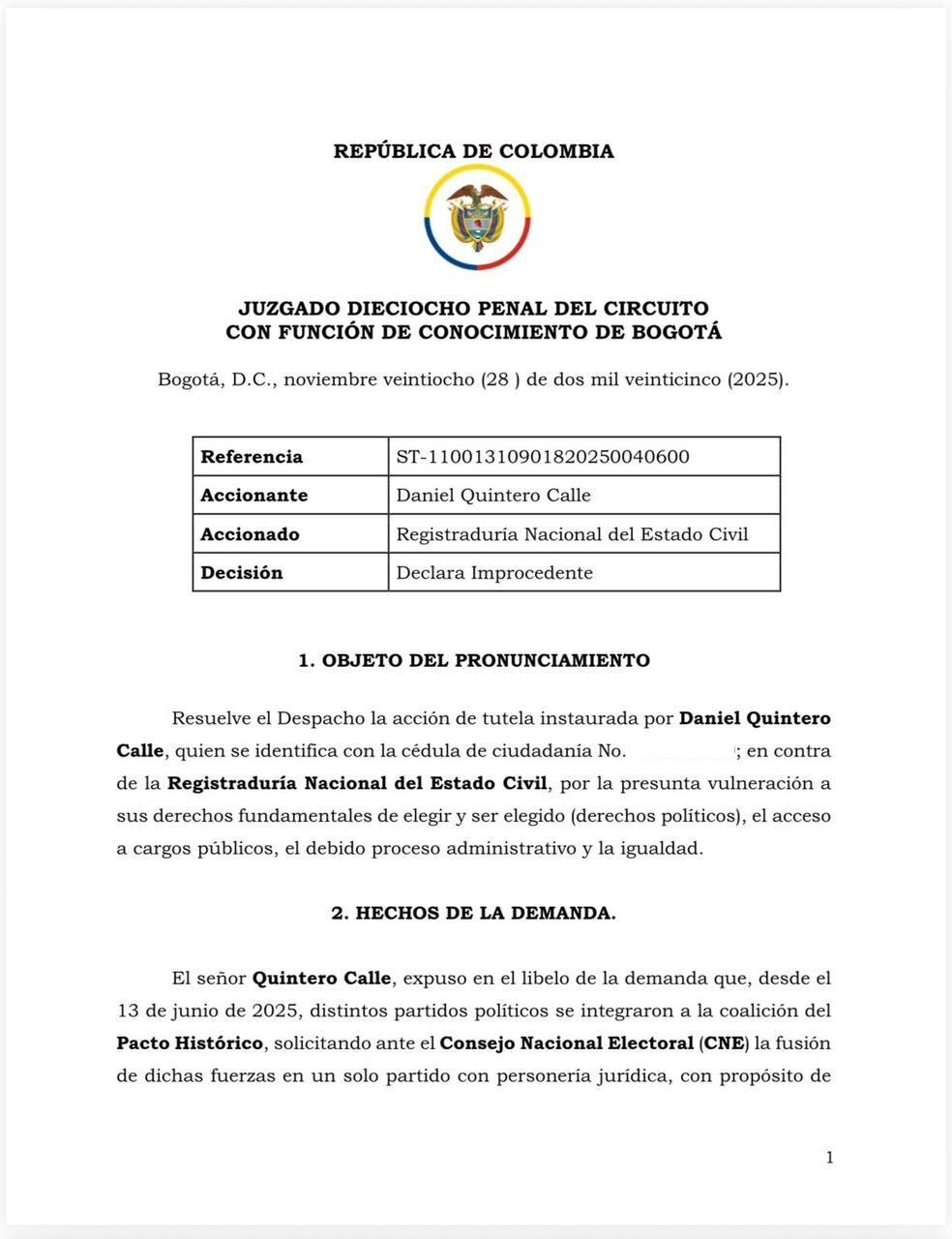 El juez 18 Penal del Circuito con Función de Conocimiento de Bogotá rechazó por improcedente la tutela que interpuso el exalcalde de Medellín contra la Registraduría Nacional del Estado Civil, con la que buscaba la inscripción del Comité de Recolección de Firmas para su eventual candidatura presidencial.