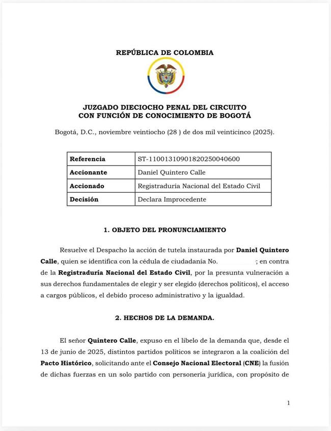 Cabe recordar que Quintero ha sostenido que su inscripción se llevó a cabo de manera autónoma y en medio de una medida cautelar decretada por el Tribunal Superior de Bogotá que luego fue dejada sin efectos.