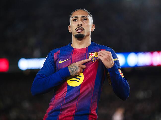Raphinha del FC Barcelona celebra su gol ante el Atlético de Madrid en el Spotify Camp Nou. FOTO: Eric Alonso/Getty Images / Eric Alonso