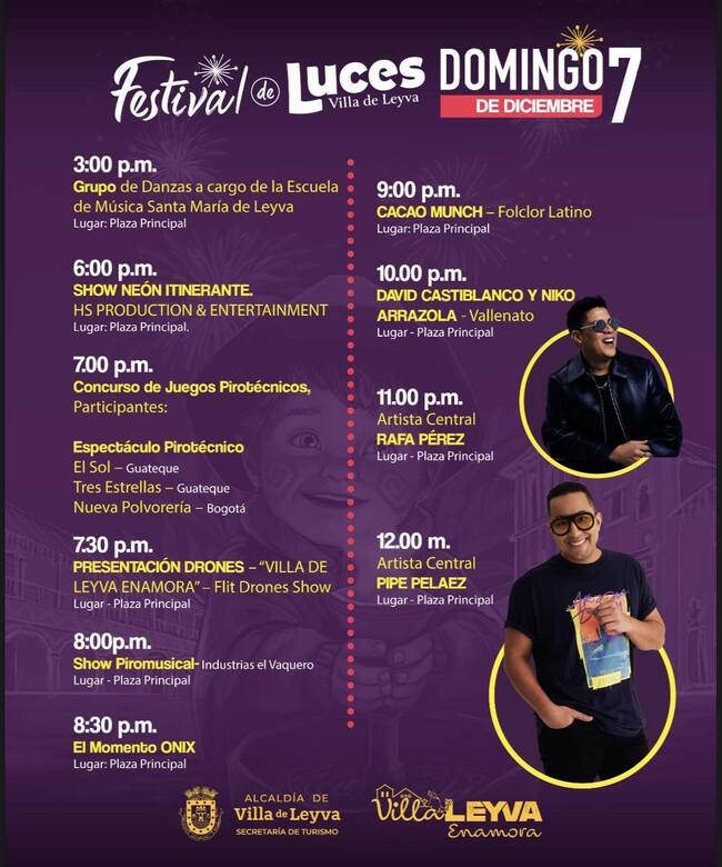 Durante tres días, la Plaza Mayor será el escenario central de espectáculos luminosos, concursos pirotécnicos profesionales, conciertos y desfiles que exaltan la identidad de Villa de Leyva. Las calles empedradas, fachadas históricas y espacios patrimoniales se transformarán en un gran escenario donde luces, proyecciones y montajes tecnológicos darán vida al festival.