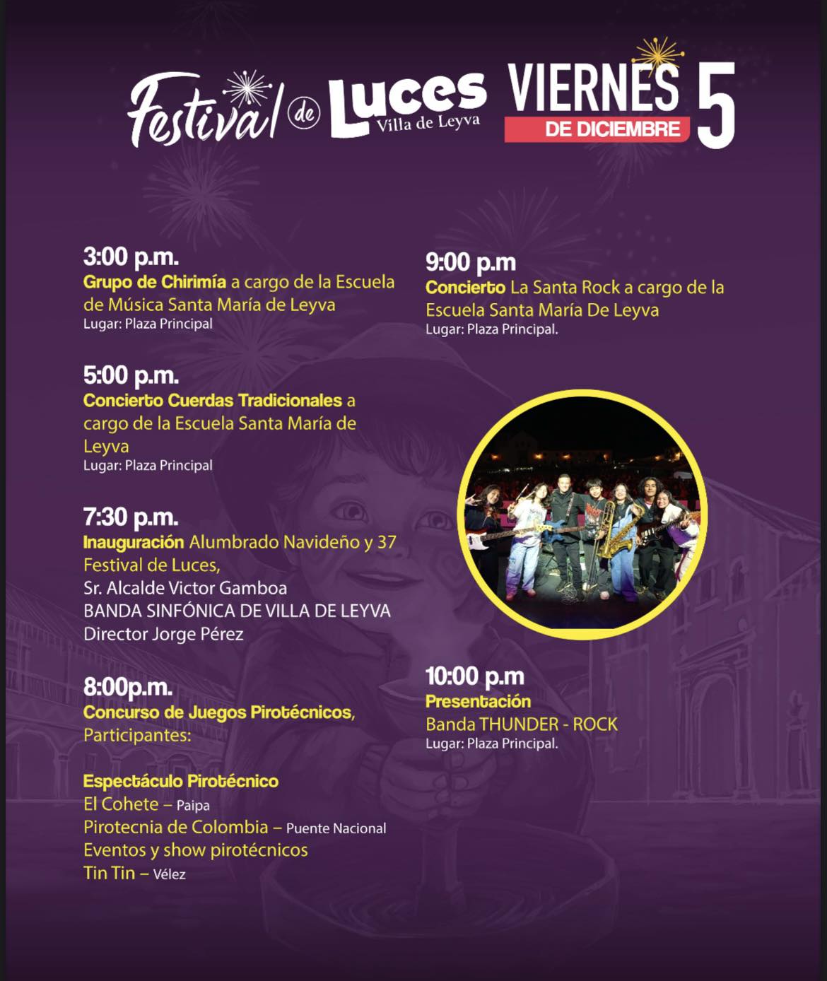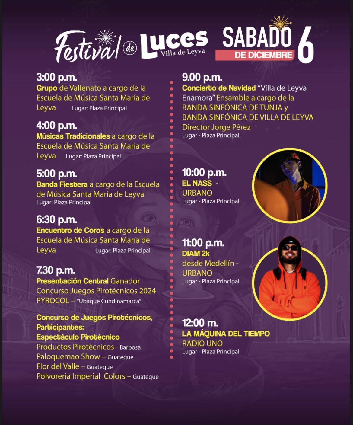 Durante tres días, la Plaza Mayor será el escenario central de espectáculos luminosos, concursos pirotécnicos profesionales, conciertos y desfiles que exaltan la identidad de Villa de Leyva. Las calles empedradas, fachadas históricas y espacios patrimoniales se transformarán en un gran escenario donde luces, proyecciones y montajes tecnológicos darán vida al festival.