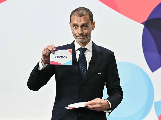 El presidente de la UEFA, Aleksander Ceferin muestra la papeleta con el nombre de Alemania, sede de la Eurocopa de 2029. FOTO: EFE/CYRIL ZINGARO