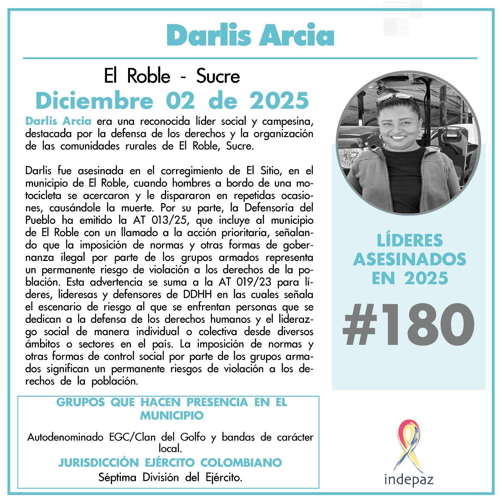 El Instituto de Estudios para el Desarrollo y la Paz (Indepaz), advirtió sobre un alarmante registro 180 líderes asesinados en lo que va corrido del año 2025 en el país, tras la muerte violenta de Darlis Arcia en El Roble.
