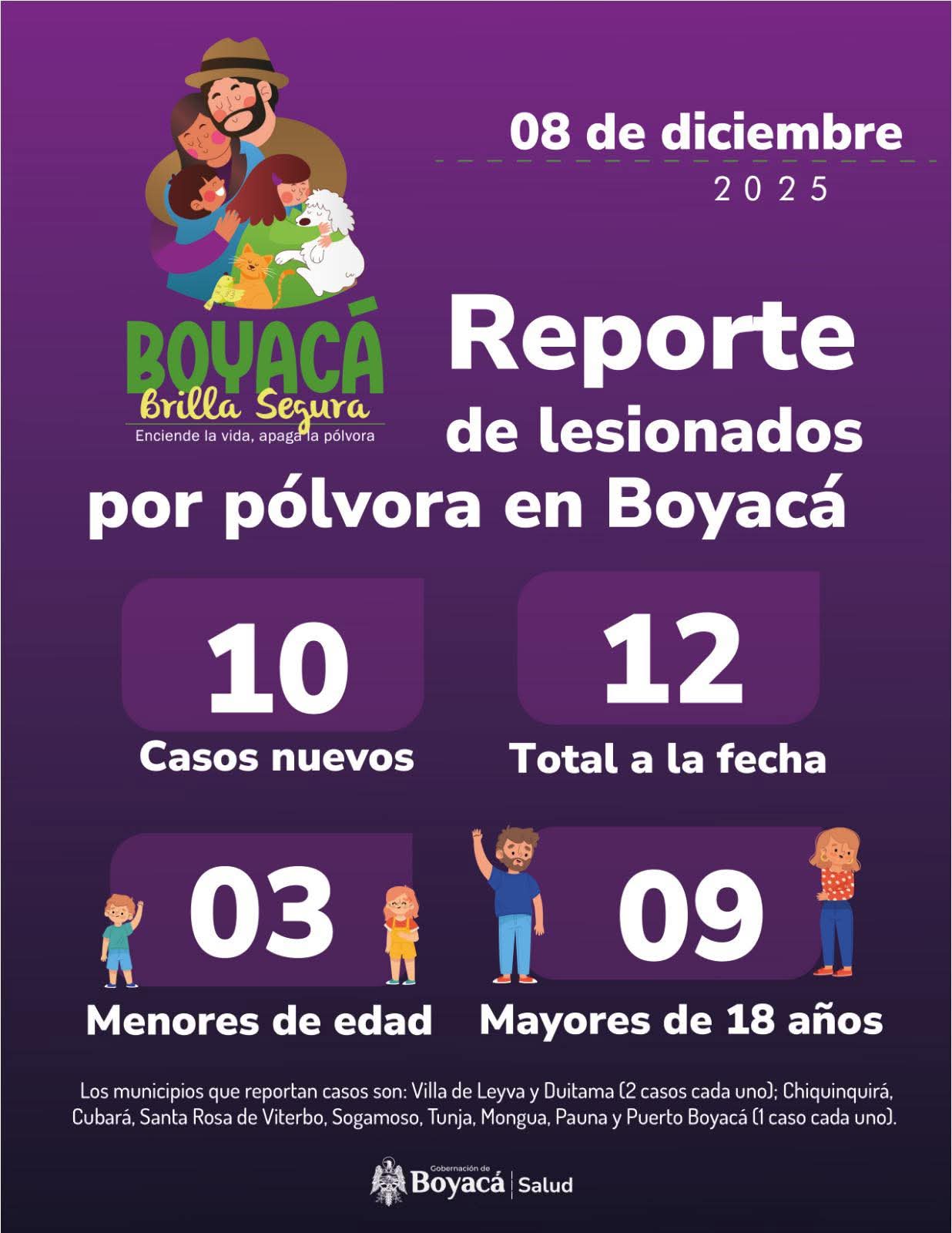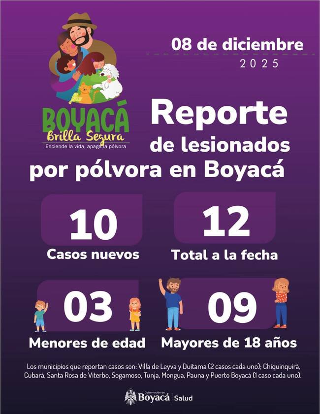 “El parte al día de hoy tenemos 12 casos de personas lesionadas, de ellos, tenemos tres menores de edad y nueve mayores de 18 años con afectaciones por quemadura con pólvora, los cuales se han registrado dos casos en los municipios de Villa de Leyva y Duitama, mientras que en Chiquinquirá, Cubará, Santa Rosa, Viterbo, Sogamoso, Tunja, Mongua, Pauna y Puerto Boyacá, se registraron de a un caso. Los menores de edad afectados se tuvieron en Cubará”, aseguró Ingrid Margarita Galán Díaz, secretaria de Salud de Boyacá.