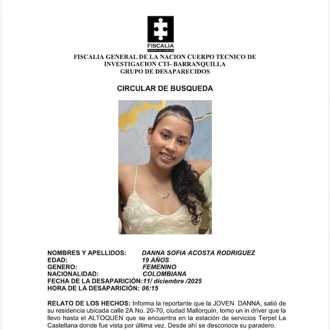 Las autoridades emitieron una alerta ante la desaparición de la joven Danna Sofía Acosta Rodríguez de 19 años, estudiante de medicina en la ciudad de Barranquilla y oriunda de Plato, Magdalena. La estudiante salió de su residencia ubicada en ciudad Mallorquín tomó un in driver el 11 de diciembre del 2025 y hasta el momento se desconoce su paradero.
