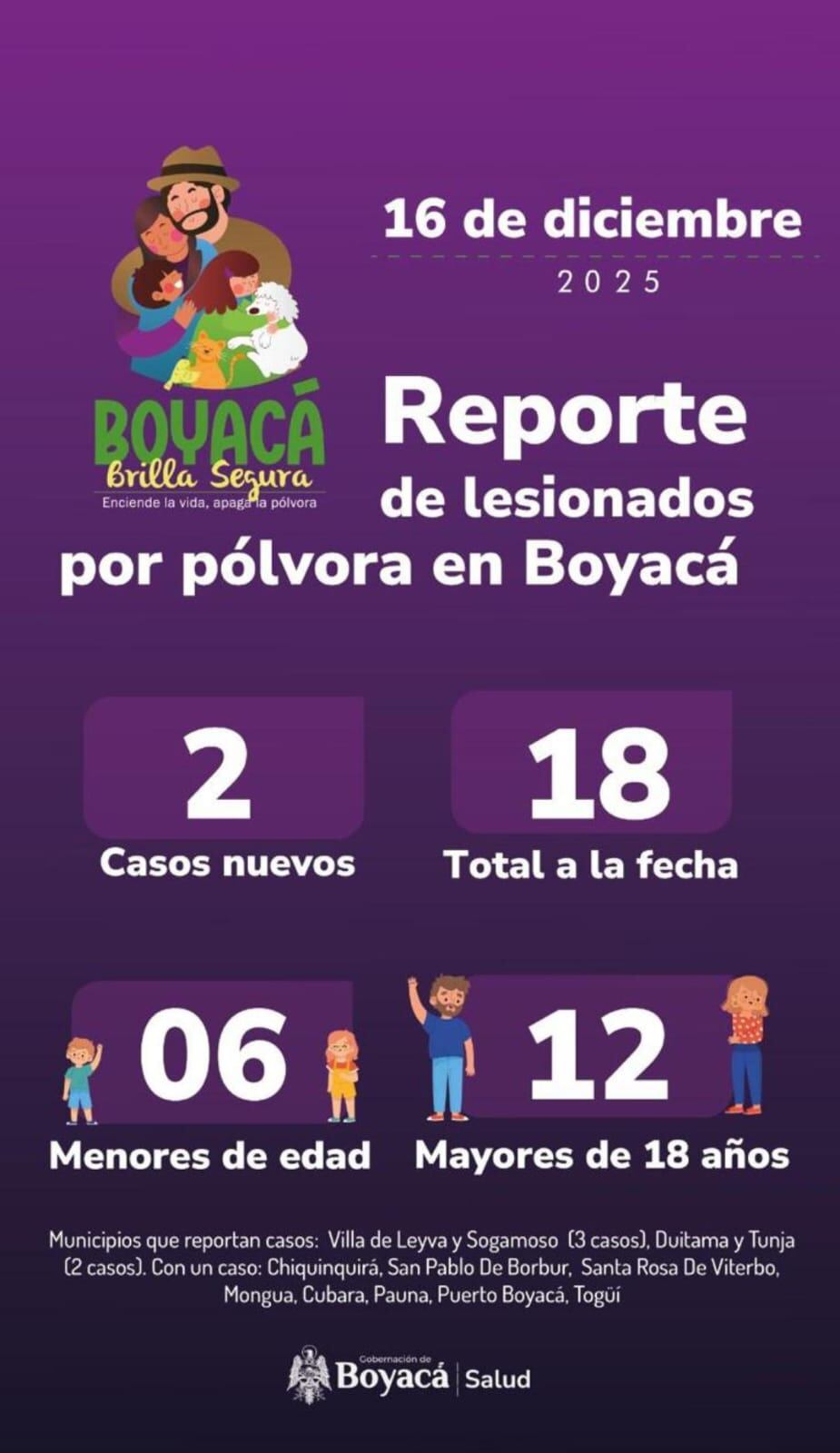 En lo que va corrido de diciembre se han registrado 18 casos de personas lesionadas con pólvora, de los cuales 5 de ellos son menores de edad. En las últimas horas se registraron dos nuevos casos de quemados, uno en Sogamoso y otro en Tunja, de ellos uno es menor de edad.
