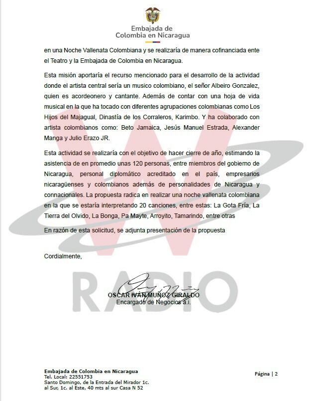 La carta que confirma que la parranda en la que estaba bailando el prófugo, sí era de la Embajada de Colombia en Nicaragua