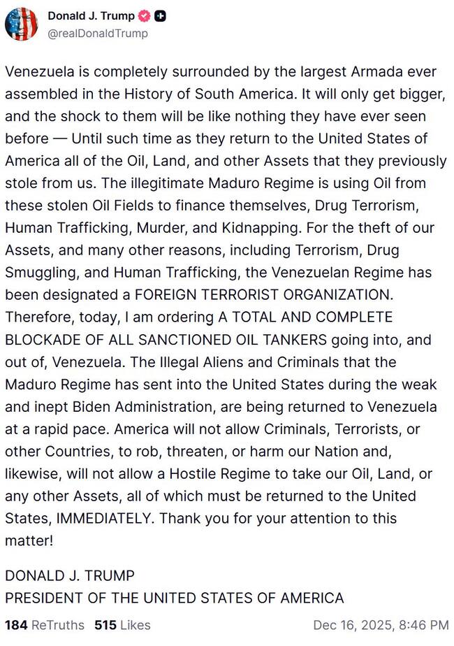 En consecuencia, se emitió una orden de bloqueo total y completo de todos los petroleros sancionados que entren o salgan de Venezuela.