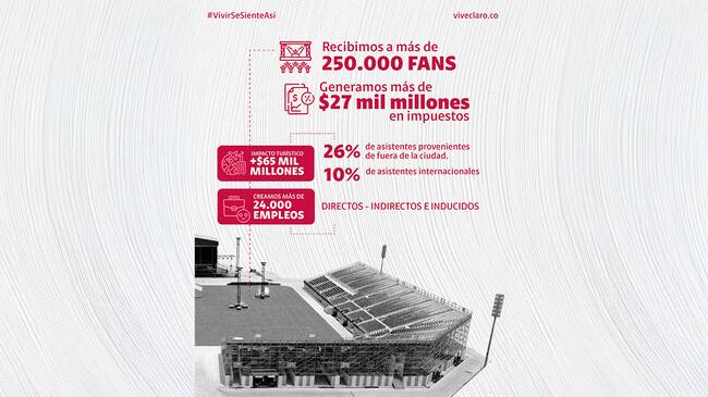 Esto se reafirma a través de las cifras, pues los 6 eventos ejecutados durante el 2025 en el Vive Claro, en los que recibieron a más de 250.000 fanáticos, generaron más de 25.000 empleos, entre directos, indirectos e inducidos, así como se aportaron más de 27.000 millones de pesos en impuestos, y se generaron más de 65.000 millones de pesos en turismo, ya que más del 10% de los asistentes a estos eventos vinieron de fuera de Colombia y más del 26% vinieron de ciudades diferentes a Bogotá.