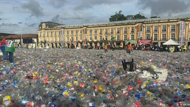 Cientos de botellas PET recicladas puestas por trabajadores de la Asociación Nacional de Recicladores en la Plaza de Bolívar. Foto: Suministrada W
