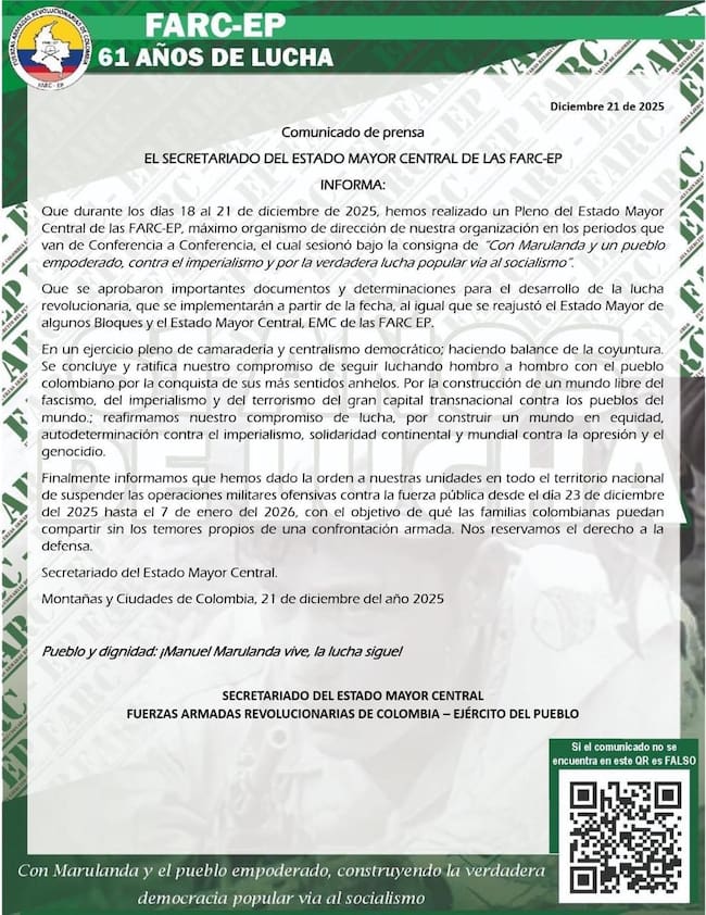 Según estos grupos armados, el cese al fuego contra la fuerza pública irá desde el 23 de diciembre de 2025 hasta el 7 de enero de 2026.