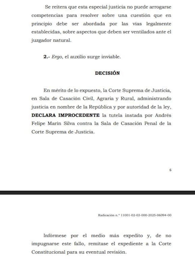 “La Corte anuncia el fracaso del resguardo por no satisfacer el presupuesto de la subsidiariedad que caracteriza esta excepcional justicia”, se lee en la decisión que advierte que la tutela fue improcedente.