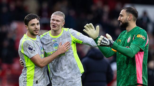 Nico González celebra la victoria del Manchester City ante el Nottingham Forest con Erling Haaland y Gianluigi Donnarumma. Foto: Andrew Kearns - CameraSport via Getty Images