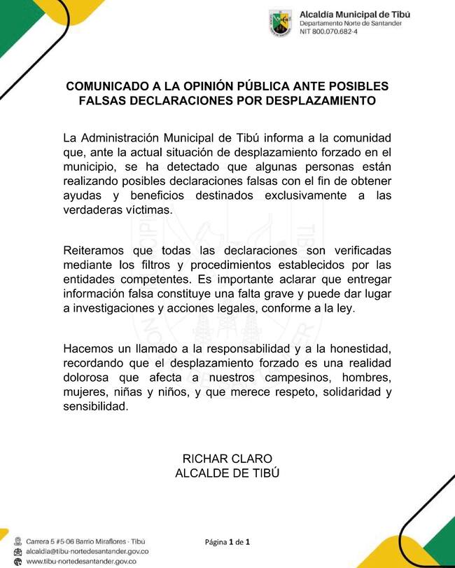 “La Administración Municipal de Tibú informa a la comunidad que, ante la actual situación de desplazamiento forzado en el municipio, se han detectado que algunas personas están realizando posibles declaraciones falsas con el fin de obtener ayudas y beneficios destinados exclusivamente a las verdaderas víctimas”, indicó la administración municipal a través de un comunicado.