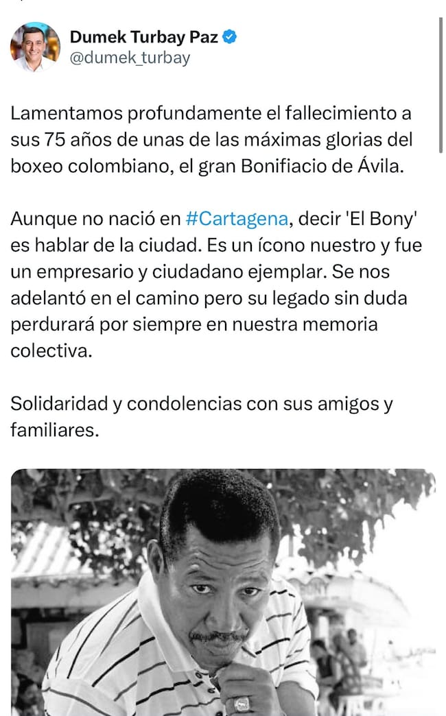 “Aunque no nació en #Cartagena, decir ‘El Bony’ es hablar de la ciudad. Es un ícono nuestro y fue un empresario y ciudadano ejemplar. Se nos adelantó en el camino, pero su legado sin duda perdurará por siempre en nuestra memoria colectiva.