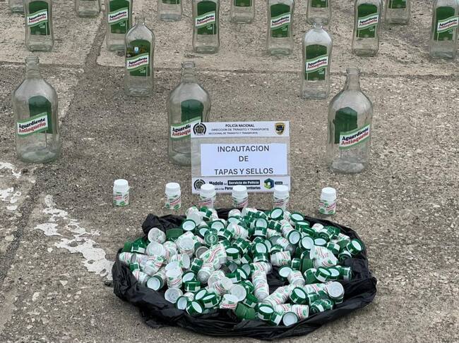 “Al verificar la carga transportada bajo la modalidad de encomienda, se halló un cargamento compuesto por: 114 botellas de vidrio vacías de 1.000 mililitro con logotipos de una reconocida marca de licor, seis botellas de vidrio vacías de 1.750 mililitro con los mismos distintivos, 202 tapas plásticas para botellas de 1.750 ml y 114 filtros plásticos”, detallaron las autoridades de Policía.