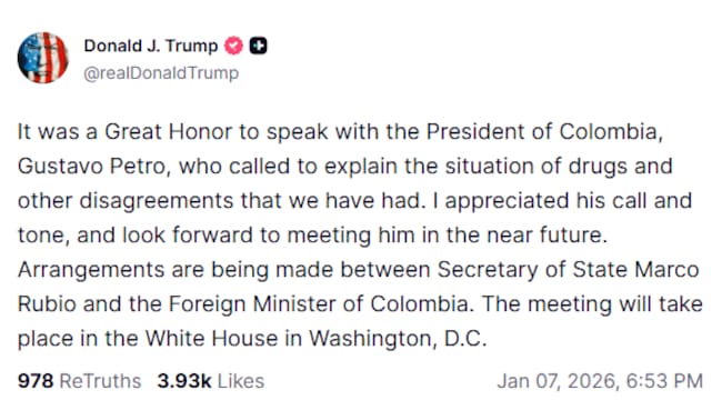 Tras una llamada telefónica sostenida este miércoles 7 de enero, en medio de la tensión diplomática entre Colombia y Estados Unidos, los presidentes Gustavo Petro y Donald Trump confirmaron que se reunirán en la Casa Blanca.