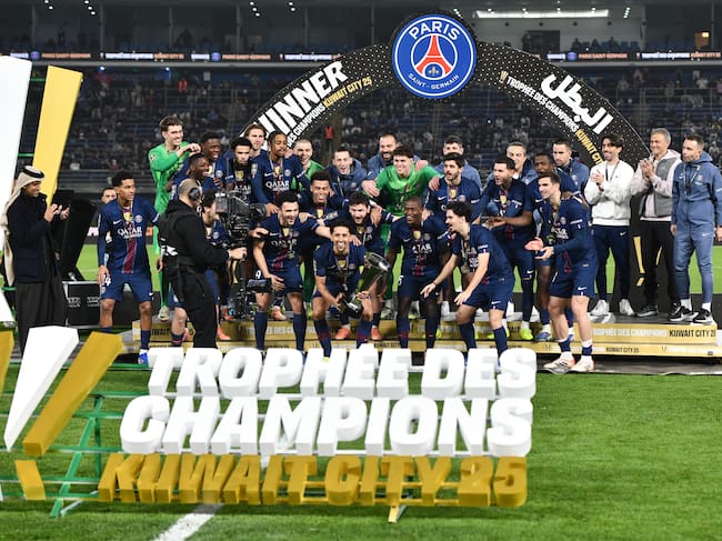 El Paris Saint Germain levantan el trofeo de la Supercopa de Francia 2025-26 en Kuwait. FOTO: Jaber Abdulkhaleq/Anadolu vía Getty Images / Anadolu