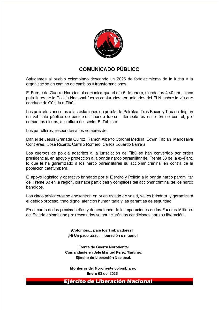 El ELN hizo un pronunciamiento frente al secuestro de los cinco uniformados de la Policía Nacional en la región del Catatumbo. Indican que el secuestro se dio por el presunto apoyo del Gobierno Nacional a las disidencias de las FARC en esta zona del departamento Norte de Santander.