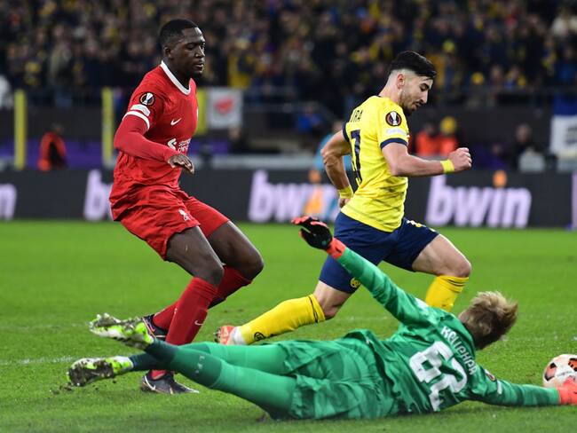 Rennes (France), 11/12/2023.- Villarreal's Ben Brereton Diaz and Villarreal's Etienne Capoue celebrate after winning against Rennes FC during the UEFA Europa League Group F soccer match between Rennes and Villarreal in Rennes, France, 14 December 2023. (Francia) EFE/EPA/YOAN VALAT