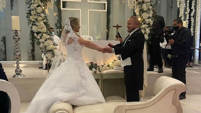Con un pomposo vestido blanco y un brillante maquillaje, periodista de Al Oído dejó ver cómo llegó a la noche de la boda. "Amar es de valientes", decía en una enorme inscripción en la recepción para enviar un profundo mensaje sobre las razones por las que se enamoró del hijo de un controvertido personaje.