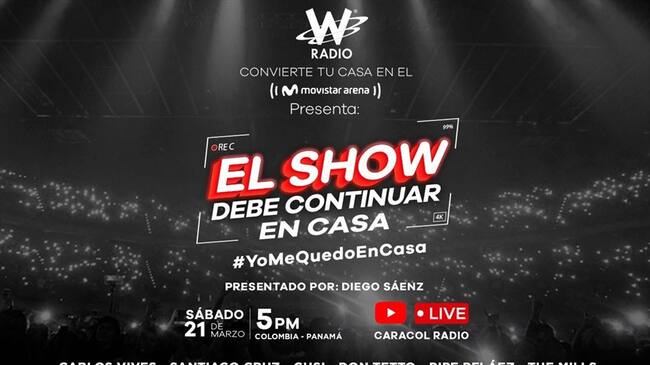 'El show debe continuar en casa' será presentado por Diego Sáenz y contará con la participación de Carlos Vives, Santiago Cruz, Gusi, Don Tetto, Pipe Peláez, The Mills, Mario Muñoz (Subcantante), Jessie Uribe, Paola Jara, Superlitio, Mike Bahía, Greeicy, Chabuco y Manuel Medrano.
