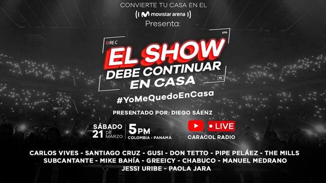 'El show debe continuar en casa' será presentado por Diego Sáenz y contará con la participación de Carlos Vives, Santiago Cruz, Gusi, Don Tetto, Pipe Peláez, The Mills, Mario Muñoz (Subcantante), Jessie Uribe, Paola Jara, Superlitio, Mike Bahía, Greeicy, Chabuco y Manuel Medrano.