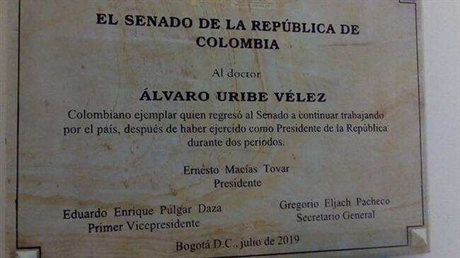 El texto dice lo siguiente: “Al doctor Álvaro Uribe Vélez, colombiano ejemplar, quien regresó al Senado a continuar trabajando por el país, después de haber ejercido como presidente de la República por dos períodos”