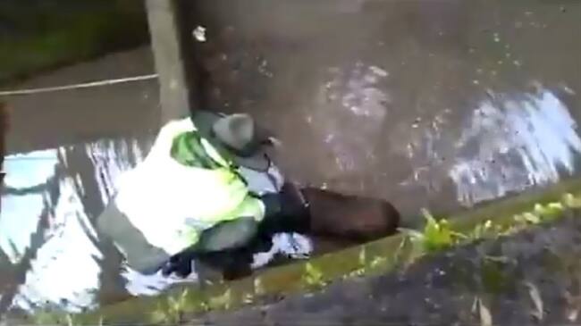 Uno de los policías se acercó y por medio de una cuerda logró sacarlo y salvarlo.