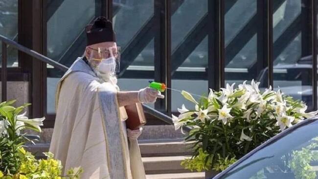 Las imágenes del sacerdote Timothy Pelc se volvieron virales, ya que se ve con una careta, un tapabocas y una pistola de juguete rociando agua bendita a sus feligreses.