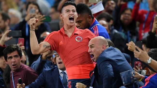 James Rodríguez celebrando el gol de Yerry Mina en partido entre Colombia e Inglaterra del Mundial de Rusia 2018. Foto: Matthias Hangst/Getty Images(Thot)