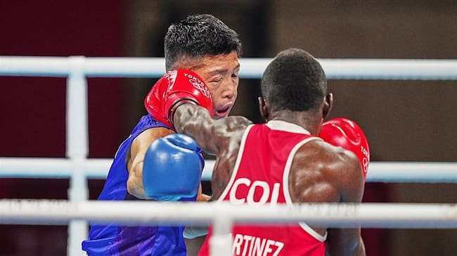 Pelea de boxeo entre el japonés Ryomei Tanaka y el colombiano Yuberjen Martínez en los Juegos Olímpicos de Tokio 2020. Foto: Ulrik Pedersen/NurPhoto via Getty Images(Thot)