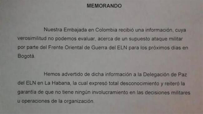 Según este memorando, firmado por el embajador, se ha informado a la Delegación de Paz del ELN en La Habana quienes afirman no tener conocimiento de este posible plan militar y aseguran que no tienen involucramiento en las desiciones militares u operaciones de la organización.