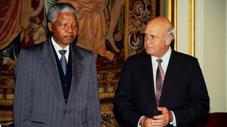 Por esos actos, fue reconocido como Nobel de Paz junto a Nelson Mandela, marcando un hito histórico en el fin del poder de los blancos para abrir paso a un sistema incluyente en su país.