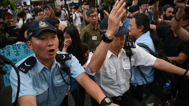 Poco antes de la tradicional ceremonia de izamiento de las banderas de China y Hong Kong por el aniversario de la retrocesión del 1 de julio de 1997, la policía cargó contra los manifestantes. Un manifestante sangraba en la cabeza, constató un periodista de la AFP.
