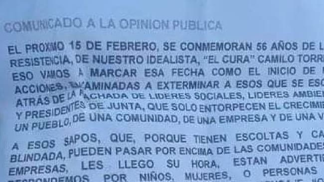 Luis Alberto González, quien es presidente de JAC de Las Parrilas, en el Puerto petrolero, volvió a ser víctima de amenazas de muerte, pero esta vez con un panfleto intimidante firmado pór, al parecer, del ELN.