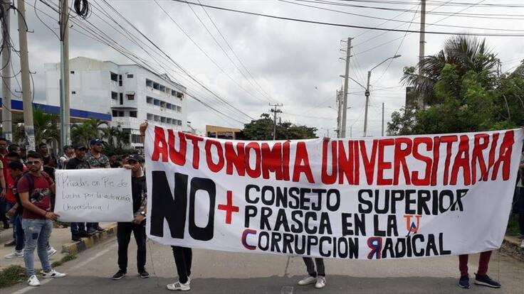 Cerca de 300 estudiantes de la Universidad del Atlántico realizan un plantón en el corredor universitario bloqueando la Vía 51b, entre Puerto Colombia y Barranquilla, con el fin de manifestar en contra del Escuadrón Móvil Antidisturbios, Esmad, y pedir la renuncia del rector Carlos Prasca.