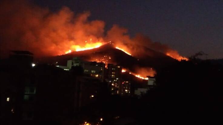 Cerca de 150 bomberos combatieron un gigantesco incendio forestal generado en los cerros de Cali, que rodearon el monumento de Cristo Rey.