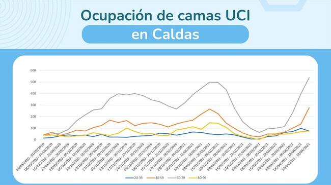 Con gran preocupación se revisan los datos que arroja el aplicativo RegistroCOVID y que en tiempo real permite el seguimiento a los niveles de ocupación de las Unidades de Cuidados Intensivos de la red hospitalaria de Caldas. Según el más reciente análisis, se observa que el grupo de personas que está entre los 40 y 79 es el que ocupa la mayoría de las UCI del departamento.