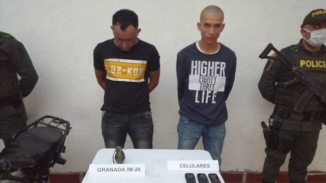 Al momento de ser, requeridos por las autoridades, tomaron una actitud sospechosa y en el registro por parte de los uniformados, les hallaron en su poder una granada de fragmentación Im-26, 03 celulares y 04 estiquer alusivos al GAO EPL.
