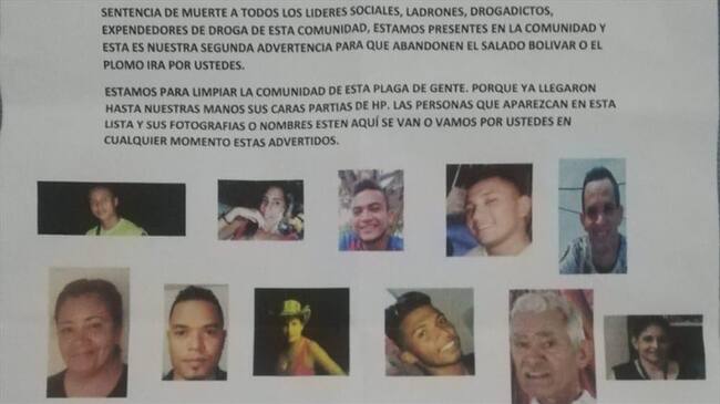 Un panfleto amenazante en donde aparecen las fotos de once defensores de derechos humanos fue difundido en El Salado, corregimiento ubicado en el departamento de Bolívar. En el documento se les conmina a que deben abandonar su labor humanitaria así como la población.