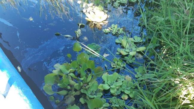 El buchón la está tapando y se observa contaminación de hidrocarburos en el espejo de agua.
